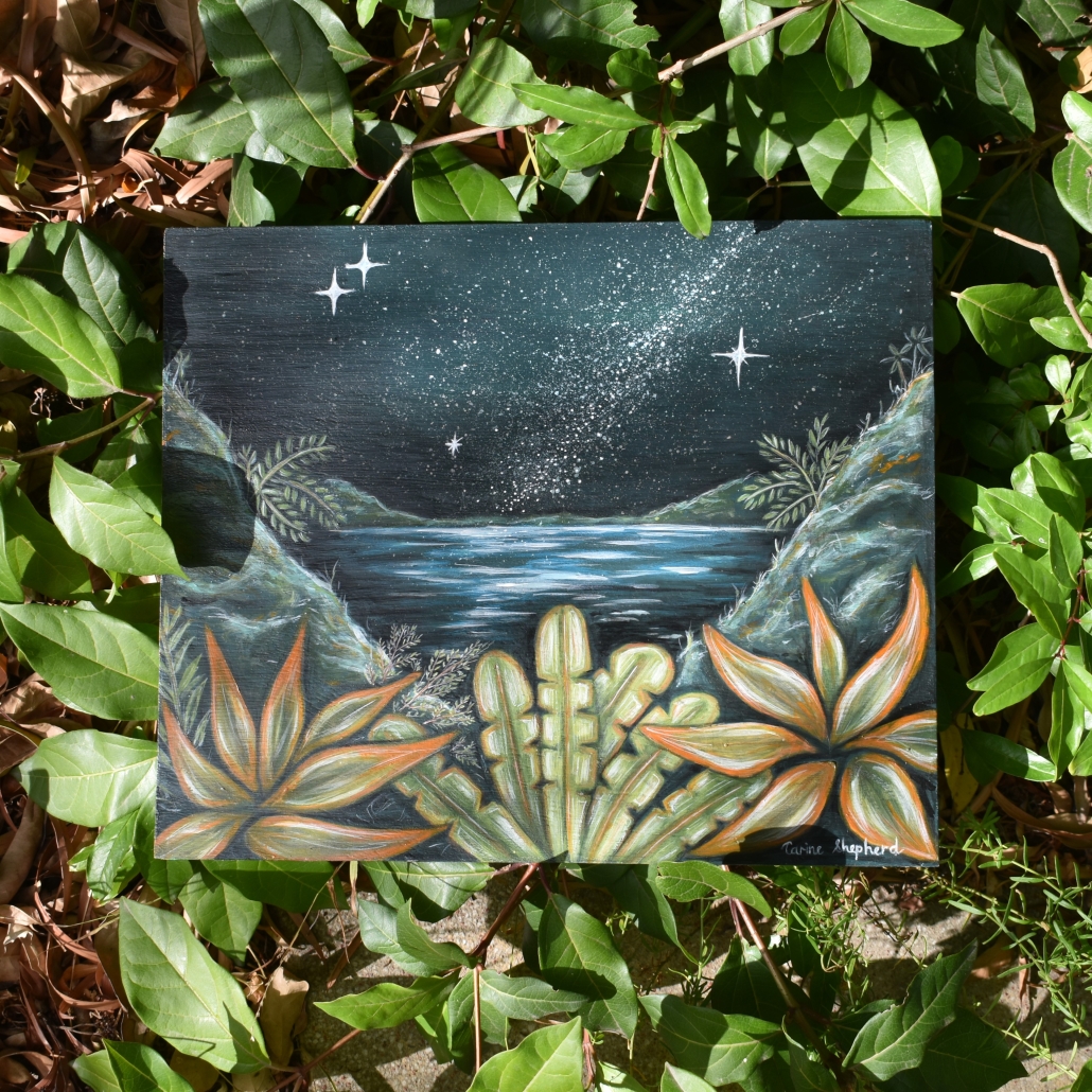 Original Acrylic artwork on a wooden board inspired by peaceful nights spent in nature.